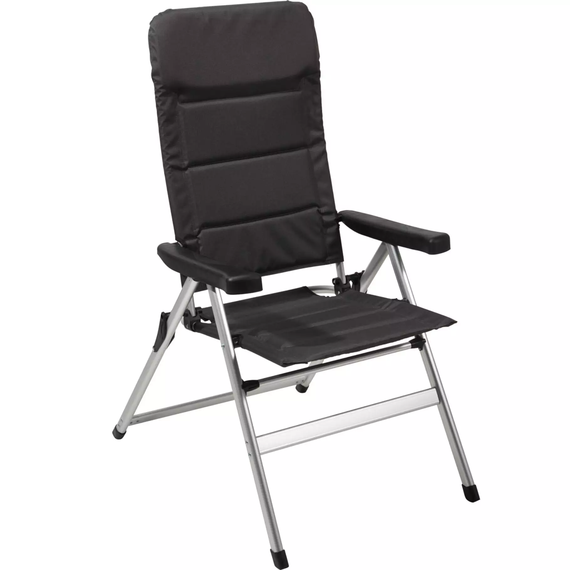 Sex olika lägen justerbar vilstol. Den lätta aluminiumramen gör det enkelt att flytta runt, och 600D polyester tyget står emot väder och slitage väl. Sitt höjd: 46 cm Sittbredd: 50 cm Sittdjup: 57 cm Totalhöjd: 120 cm Armstödens höjd: 67 cm Bredd mellan armstöden: 49 cm Totalbredd: 64 cm Material: aluminium, 600D polyester, PP Färg: svart, aluminiumram Maximal belastning: 120 kg