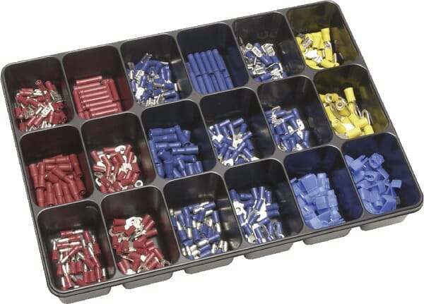 Innehåll: Röda: 50 st 6,3x0,8 mm, 25 st Ø4, hane & hona, 25 st M4 & M5 Blå: 25/50 st 6,3x0,8 mm, 25 st Ø5, hane & hona, 25 st M4 & M5 Gula: 25 st 6,3x0,8 mm, 25 st M8 Anslutningar: 25 st röd & blå Anslutningar: 25 st Totalt 475 st