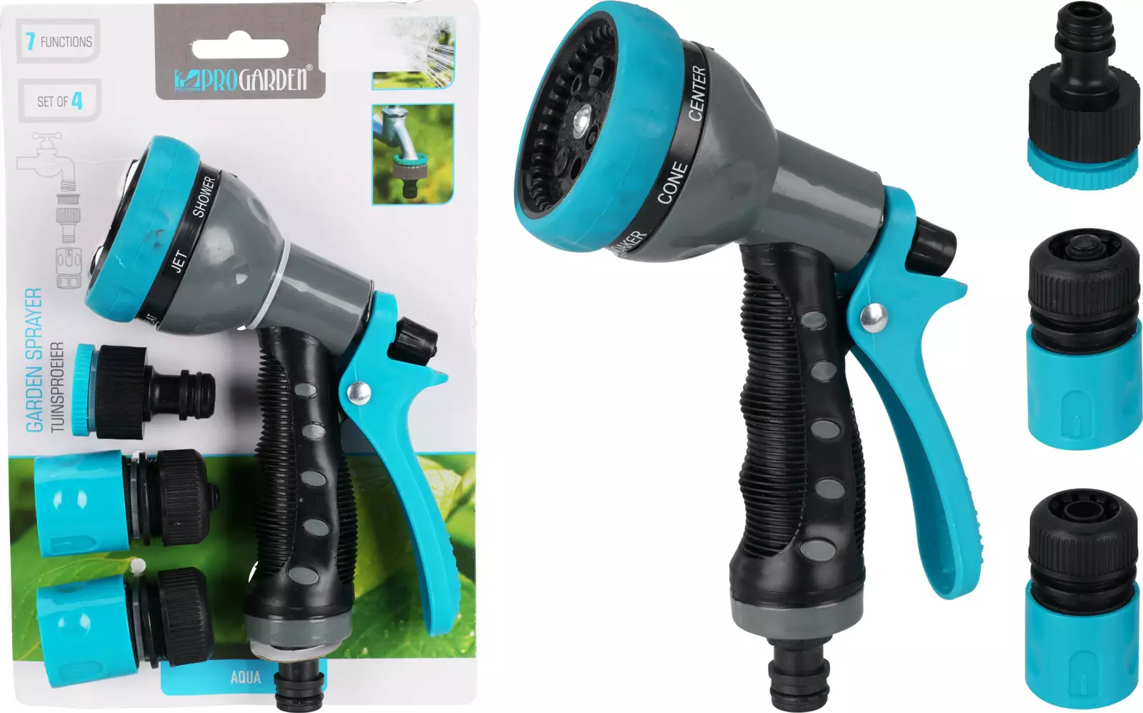 Duschhuvudet har sju duschlägen.Inkluderar 3 universalkopplingar som passar de flesta vanliga trädgårdsslangar.