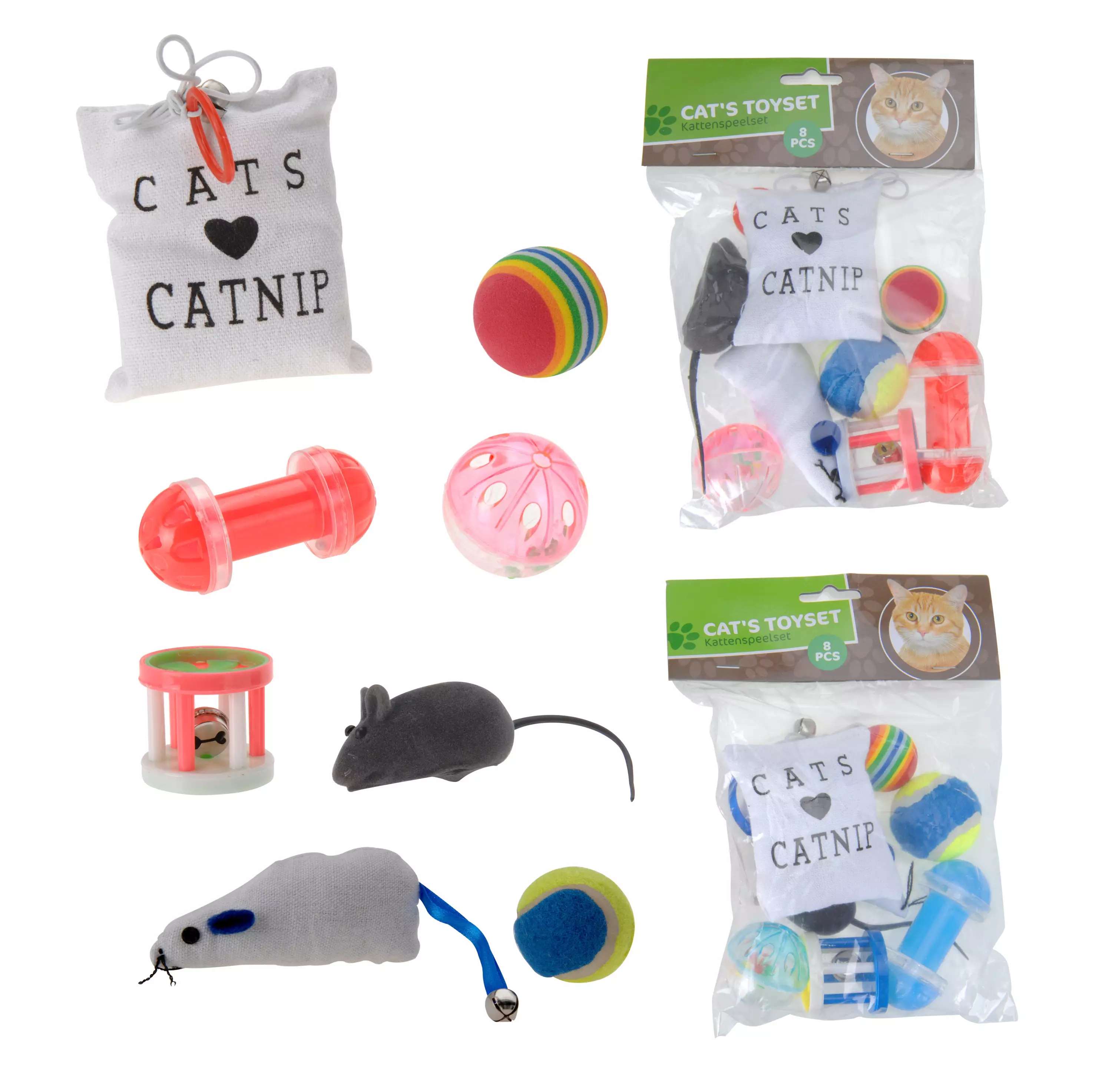 kattens leksakssats - inkluderar 8 leksaker: bollar, fjädrar, möss, mintkudde - 2 olika påsar, vid beställning får du slumpmässigt en av dem