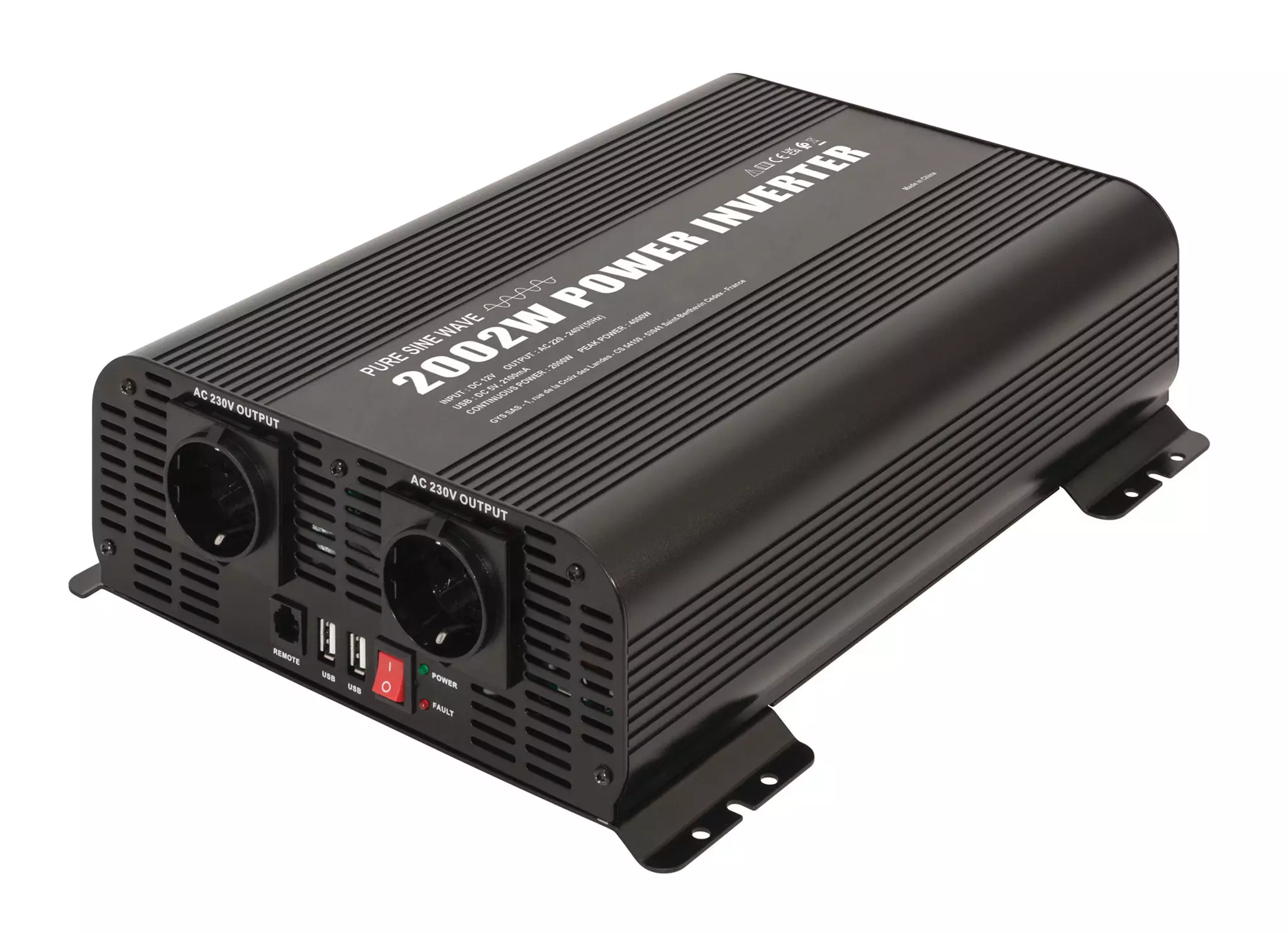 PSW 2002W RC-24 -omvandlaren konverterar ett 24 V-batteri till en 230 V strömkälla för alla apparater upp till 2000 W.Den omvandlar mycket effektivt och producerar ren sinusvågström som passar alla de mest känsliga hushållsapparaterna.Lätt och stabil, den kan bäras eller installeras permanent.Fjärrkontrollen möjliggör fjärrstyrning när omvandlaren är installerad på en svåråtkomlig plats. Högkvalitativ ren sinusström:* Den ström som produceras av omvandlaren är densamma som den som produceras av det offentliga nätet.* Ingen påverkan vid spänningsspikar, omvandlaren justerar automatiskt den nödvändiga effekten.* Idealiskt för apparater som är känsliga för strömbortfall eller stora effekter. Hög verkningsgrad utan energiförlust:* PSW 2002W RC-24 producerar mer energi än en vanlig växelriktare eftersom dess omvandlingskapacitet är mycket hög (upp till 90 %).* Med fjärrkontrollen kan omvandlaren stängas av och strömförbrukningen begränsas när den är tom. Batteriet urladdas inte och behåller all sin energi. Praktisk och funktionell design:* Kompakta produkter med monteringssystem är utformade för att enkelt kunna flyttas eller installeras permanent i ett fordon.* 2 uttag för alla elektriska apparater: 2 vägguttag (230V), 2 USB-uttags (5V). Säker att använda:* Överhettningsskydd, ventilerad.* Kortslutningsskydd.* Under- och överspänningsskydd. Fjärrstyrning tack vare fjärrkontroll:Den medföljande fjärrkontrollen för omvandlaren kan monteras 6 meter bort tack vare den långa kabeln.Den har tre funktioner:* Styr omvandlaren på avstånd med sin On/Off-knapp.* Varnar med en indikatorlampa vid fel.* Ger information om batteristatus och strömförbrukning med hjälp av en digital skärm. - 2000/4000W- 385x250x100 mm- vikt 5,75 kg