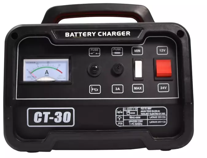 För laddning av batterier i person- och lastbilar, motorfordon och motorcyklar. • Lämplig för laddning av bly-syrabatterier och gelbatterier • Överbelastningsskyddad • Tydlig och lättläst amperemeter • Hållbar metallram och bärhandtag • För laddning av 12V och 24V batterier Ansluts till en 16A Schuko-kontakt. Spänning: 230V 50Hz Laddningsspänning och -effekt: 12V / 450W, 24V / 450W Laddningsspänning och -ström: 12V / 15A, 24V / 13A Maximal ström: 30A Batterikapacitet: 30-220Ah Skyddsklass IP20 Överbelastningsskydd Ja Amperemeter Ja Längd 260 mm Bredd 240 mm Djup 210 mm Vikt 5,5 kg