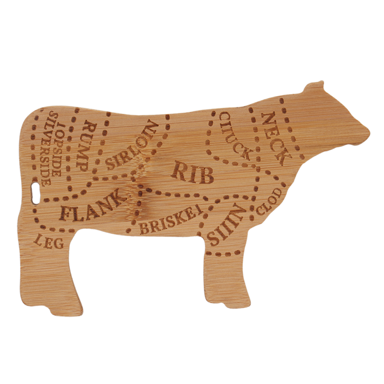 skärbräda i bambu (FSC 100%) formad som en ko - 19 x 12,2 cm - tjocklek 1,1 cm - vikt cirka 100 g
