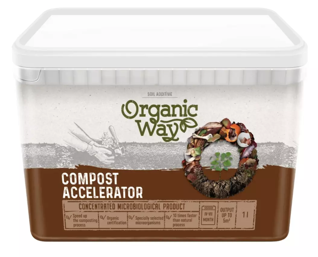 Koncentrerad mikrobiologisk produkt avsedd för hantering av växtmaterial samt för att påskynda nedbrytnings- och komposteringsprocesser. Produkten kan påskynda komposteringsprocessen upp till tio gånger, förhindrar luktproblem i komposthögen och hjälper till att producera högkvalitativa organiska gödningsmedel för din gård. Produkten är tillverkad av patenterade mikroorganismer och har ekologisk certifiering. Användning: Dosera 150 ml kompostaktivator per 1 m3 färskt växtmaterial. Sprid ut det jämnt och vattna. Håll komposthögen konstant fuktig. När nytt växtmaterial har lagts till bör processen upprepas. Gräv eller stick hål i komposthögen så att luft kan cirkulera. Den bästa kompostkvaliteten uppnås genom att blanda trägrenar och mjukt grönt material i förhållandet 1:5. Det rekommenderas att täcka komposthögen för att förhindra att vatten avdunstar och för att bevara den naturligt höga temperaturen i högen. Sammansättning: Kompostens sammansättning är som följer: Lactobacillus Farciminis CNCM-I-3699 och Lactobacillus Rhamnosus CNCM-I-3698 bakterier. Animaliska biprodukter är inte lämpliga för kompostframställning! Produkten har certifiering för ekologisk odling enligt rådets förordning (EG) nr 834/2007 och kommissionens förordning (EG) nr 889/2008.