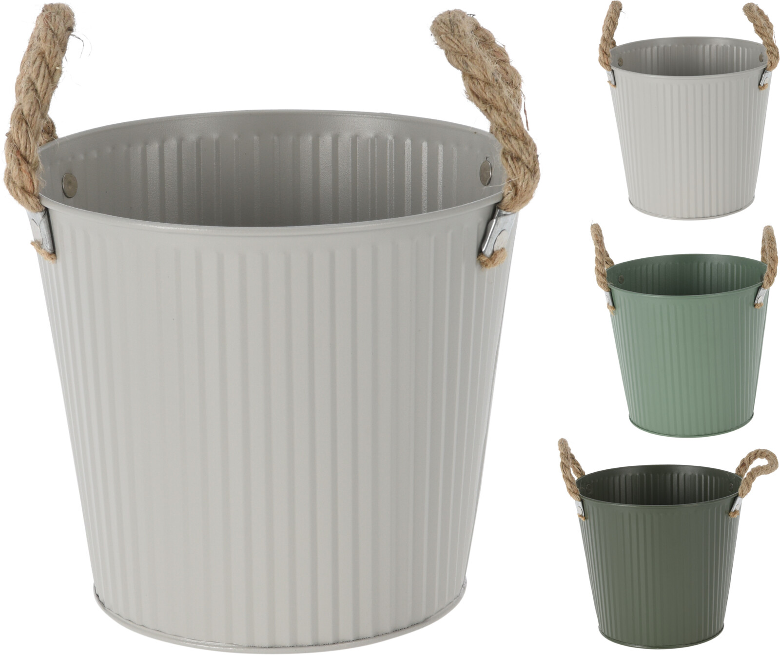 grön plåtkruka med jutesnörehandtag - övre diameter cirka 18,5 cm - bottendiameter cirka 13 cm - kantens höjd cirka 16 cm