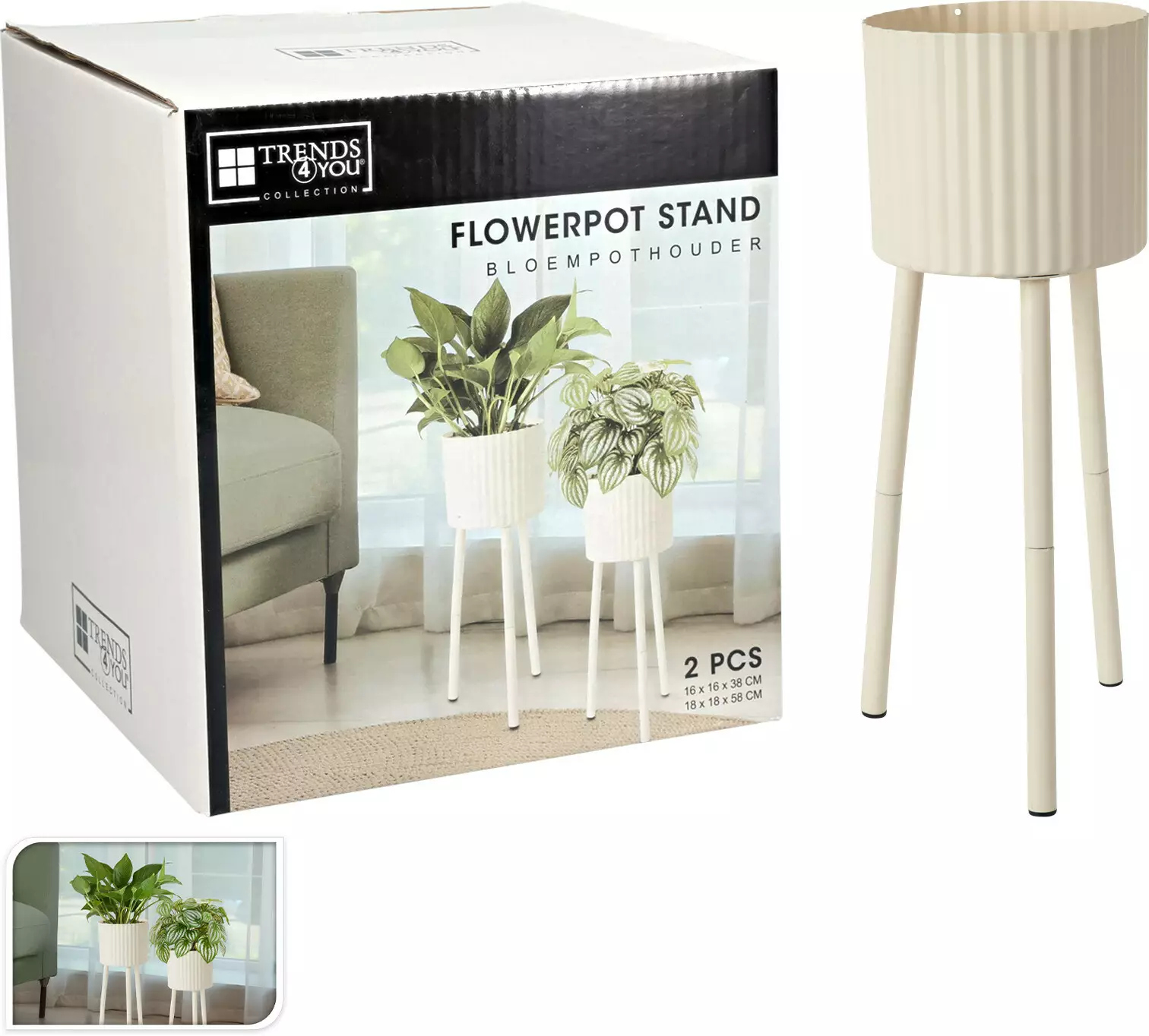 Vacker och hållbar krukuppsättning för gröna växter. Krukorna och fötterna är målade i en krämig beige färg. Kan även användas utan fötter, som går att skruva bort.Krukans yta är vågig, botten platt och utan hål.Satsen innehåller två krukor med mått:- stor diameter 18 cm, totalhöjd 58 cm- liten diameter 16 cm, totalhöjd 38 cm