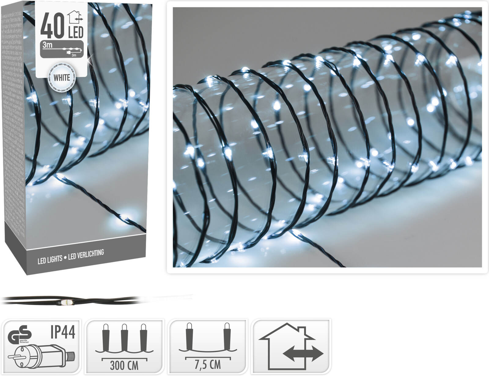 Kallvit klar LED-ljusslinga för inomhus- och utomhusbruk- 40 LED-lampor- längd 3 meter- IP 44- avstånd mellan lamporna 7,5 cm- strömkabel 3 meter