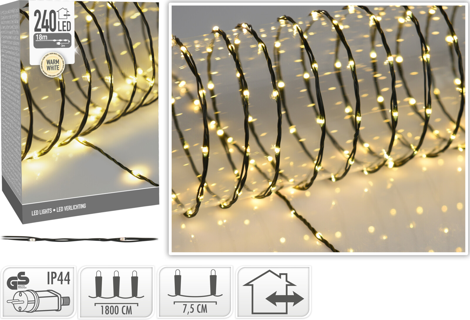 Varmvit LED-ljusslinga för inomhus- och utomhusbruk - 240 LED-lampor - längd 1,8 meter - IP 44 - avstånd mellan lamporna 7,5 cm - strömkabel 3 meter