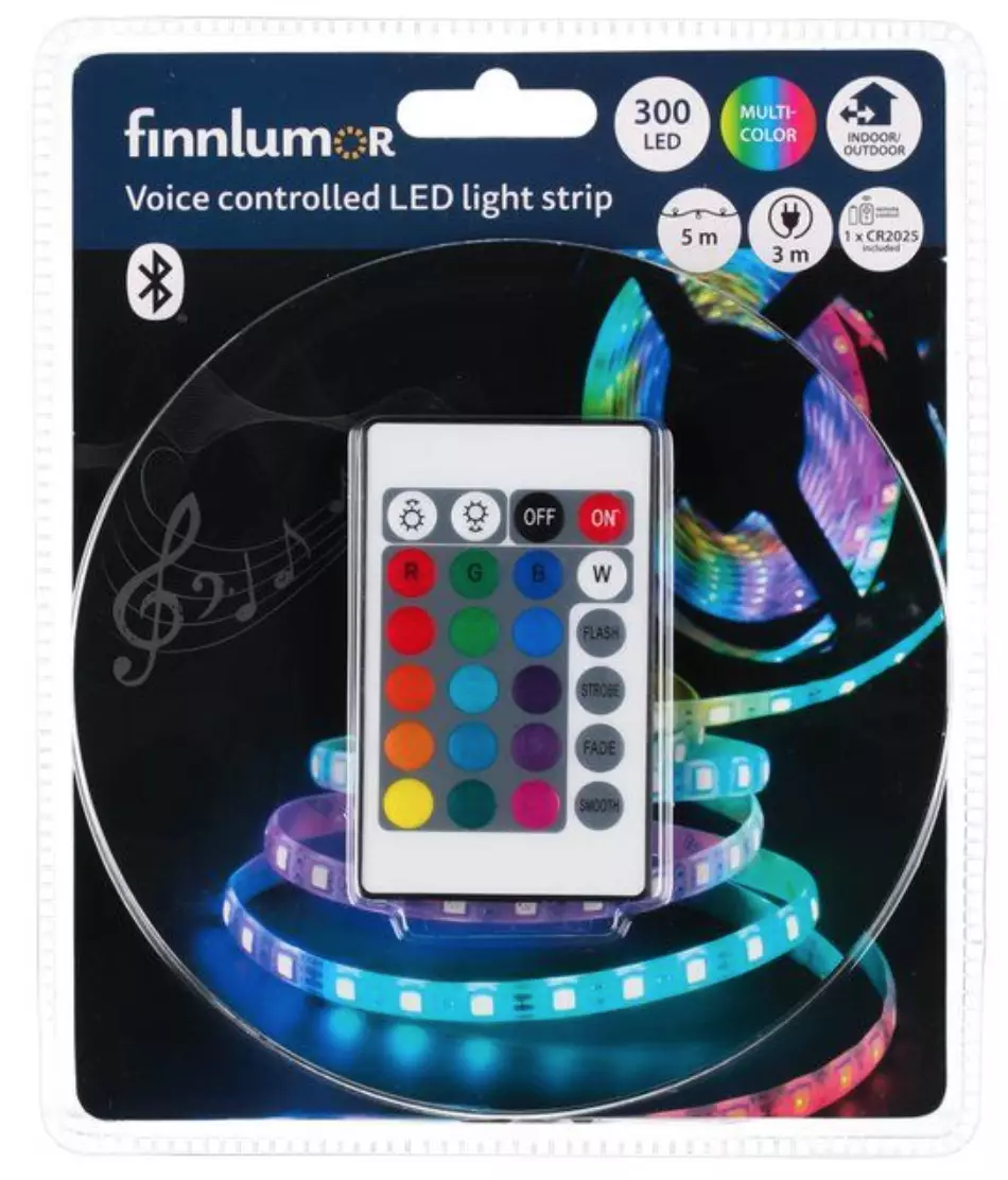 Finnlumor LED-strips 5 m RGB fungerar både med fjärrkontroll och genom appstyrning med röstkommandon. Med LED-strips kan du enkelt skapa stämningsbelysning och indirekt ljus i inredningen. Du kan välja mellan olika färger och färgtemperaturer samt olika färgkombinationer. LED-strips är mycket lätta att installera: kontakterna i nätadaptern och LED-stripsen kopplas till mottagaren, och anslutningen är klar. Stripsen är enkel att fästa på rena ytor med den självhäftande baksidan. Musiktillståndet låter dig få stripsen att följa rytmen av musiken som spelas. Tekniska specifikationer: 300 stycken RGB LED-lampor, 3M-tejp, 12V lågspänningsadapter, bluetooth-styrning, stripsens effekt 12W, ljusstyrka 550 lm. Anslutningskabel 3 m. Funktioner inkluderar jämnt brinnande ljus (sju färgalternativ), växling mellan tre färger, växling mellan sju färger, glidande växling mellan sju färger. Blinkande ljus, långsam pulserande ljus. Musikgränssnittet är indelat i två delar: musik och mikrofon. I musiktillståndet sätts lamporna för att reagera på musik som spelas från telefonen och i mikrofontillståndet reagerar de på ljud runt mikrofonen. Användarinstruktionerna innehåller anvisningar för nedladdning och användning av appen. Lämplig för både inomhus- och utomhusbruk. Bredd16,5 cmDjup7 cmHöjd20 cmVikt0,27 kgFärgflerfärgadMaterialplast, koppar