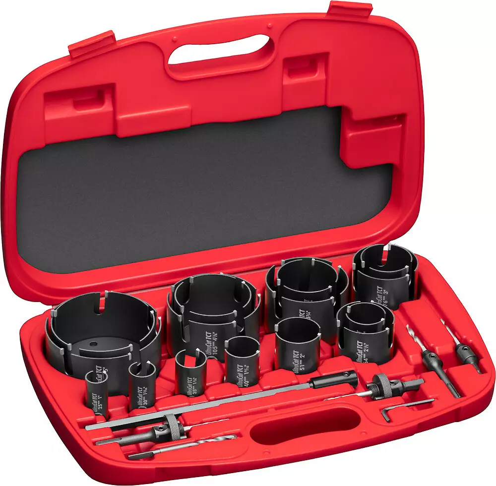 Set av hålsågar i hårdmetall som är perfekta för snabb och precis sågning av trä, plast eller mjuka cementbaserade material. - TCT-hålsågen möjliggör smidig sågning till full djup utan att brinna fast eller ha problem med borttagning av spån. - Betydligt djupare sågning på 55 mm jämfört med vanliga hålsågar, vilket gör att du kan såga igenom de vanligaste konstruktionsträden med ett enda snitt. - Hålsågens egenskaper är optimala för trä och träfiberbaserade byggmaterial. Innehåller: Hålsågar: - 25, 30, 35, 40, 45, 51, 60, 65, 70, 76, 86, 95, 105, 114, 127 mm - 1", 1 ³/16", 1 ³/8", 1 ?/16", 1 ²5/32", 2", 2 ³/8", 2 ¹/2", 2 ³/4", 3", 3 ³/8", 3 ³/4", 4 ¹/8", 4 ¹/2", 5" Adapter: - 49005, 49007, 49010, 49020 + Förlängningsstång 12" + TCT-fixeringsborr + Insexnyckel 4 mm Setets väska är designad för sågar upp till 127 mm och innehåller också platser för alla vanliga tillbehör för hålsågar. Hålsågarna kan förvaras staplade, där de mindre sågarna ligger inuti de större.