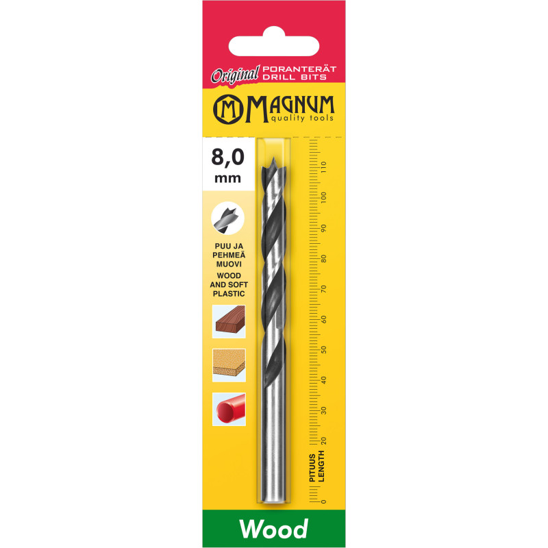 Maskinträborrspets - 3 och 4 mm 2 st/pkt, större 1 st/pkt - för trä och mjuk plast - spetsen möjliggör noggrann placering av hålet och eliminerar förskjutning vid start - ingen självgående spets - även för mjuka plaster där smältning är ett problem med vanliga borrspetsar - storlekar 11 - 16 mm: skaftdiameter minskad till 10 mm - storlekar 13 och 20 mm: skaftdiameter minskad till 13 mm