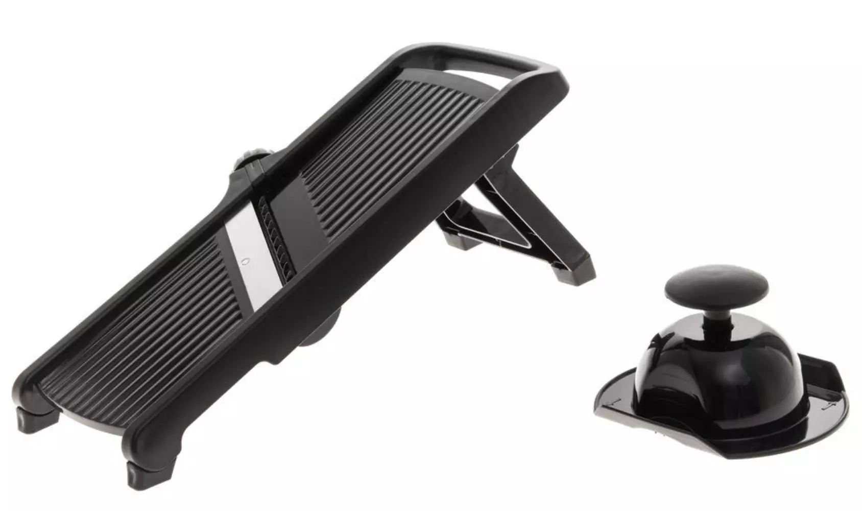 Med mandolin-skäraren kan du snabbt och enkelt skiva och strimla grönsaker med jämn precision. Ett utmärkt hjälpmedel i köket. Den har ett roterande integrerat blad, två vertikala knivar och en skivkniv med justerbar tjocklek. Inkluderar finger-skydd. Tål maskindisk. Bredd39 cm Djup7,5 cm Höjd17 cm Vikt0,53 kg FärgSvart MaterialPolypropen, metall