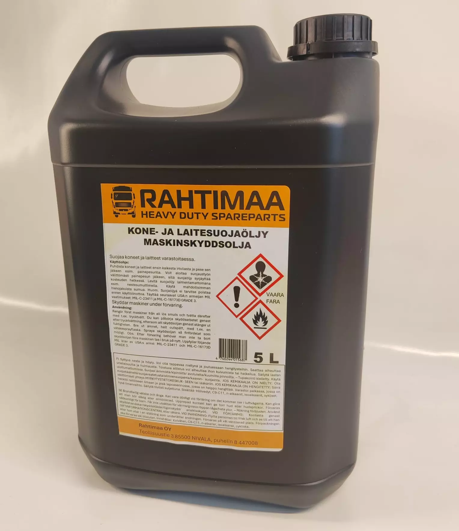 Maskin- och utrustningsskyddsolja 5 liter Denna högkvalitativa skyddsolja bildar en hållbar skyddande film som förhindrar rost och korrosion både inomhus och utomhus. Särskilt lämplig för långtidsförvaring av lantbruksmaskiner, verktyg, industrimaskiner och andra metallytor samt skydd av bearbetade delar. Skydda maskiner och utrustning vid lagring. Produkten uppfyller följande krav från den amerikanska armén: MIL-C-23411 och MIL-C-16173D GRAD 3 Bruksanvisning:Rengör maskiner och utrustning från allt löst smid först och tvätta sedan till exempel med högtryckstvätt. Du kan påbörja skyddsarbetet omedelbart efter högtryckstvätten, eftersom skyddsoljan fördriver fukt på ett ögonblick.Använd så fin spray som möjligt. Obs! Skyddsoljan behöver inte tas bort innan maskinen tas i bruk.