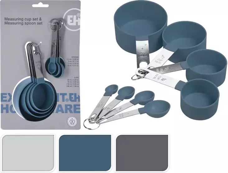 - 8-delad mätset som innehåller fyra måttkoppar och fyra måttskedar - tillverkad av hållbar polypropen med rostfria handtag - måttkopparnas volymer är 59 ml, 78 ml, 118 ml och 236 ml - måttskedarnas volymer är 2,5 ml, 5 ml, 7,5 ml och 15 ml Finns i olika färger (visas på bilden), och vid beställning får du en slumpmässig variant (blandad produkt)