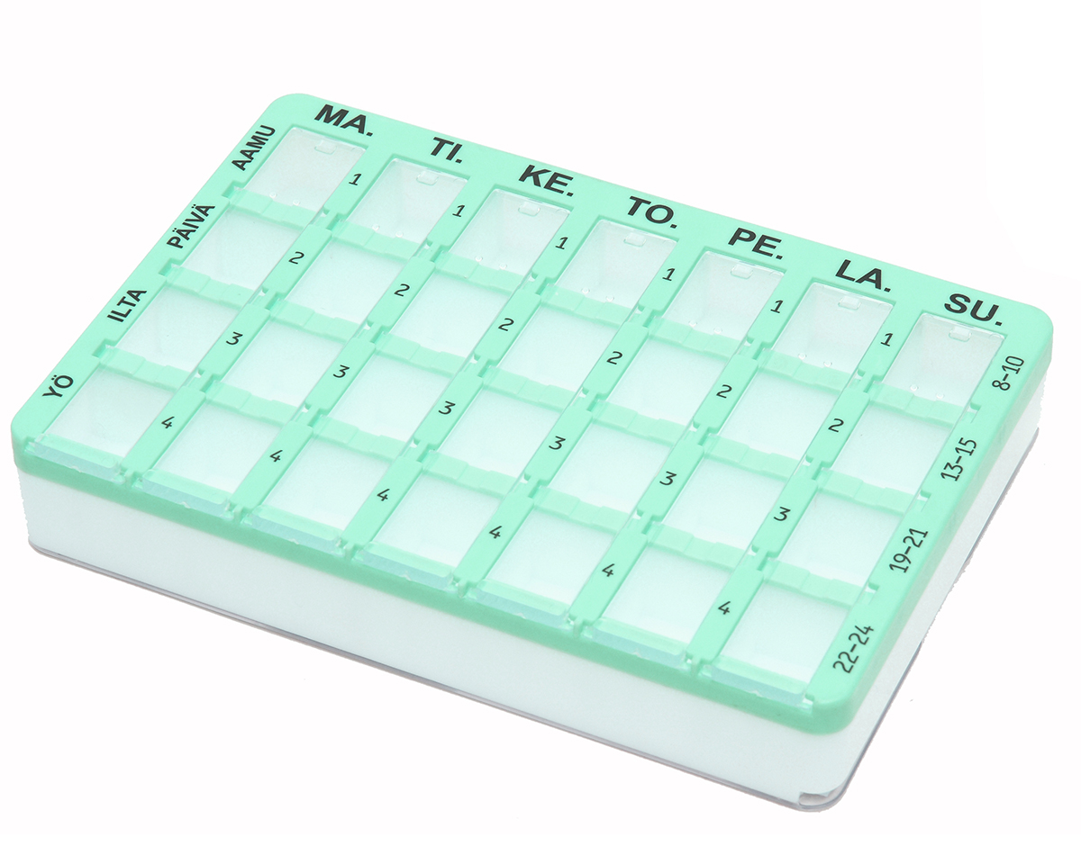 plastisk medicindosett - mått: 15,5x10,5 cm - för veckans mediciner (mån-sön) - egna fack: morgon 8-10, dag 13-15, kväll 19-21, natt 22-24 - på lådans botten kan du lägga till exempel recept... Läs mer