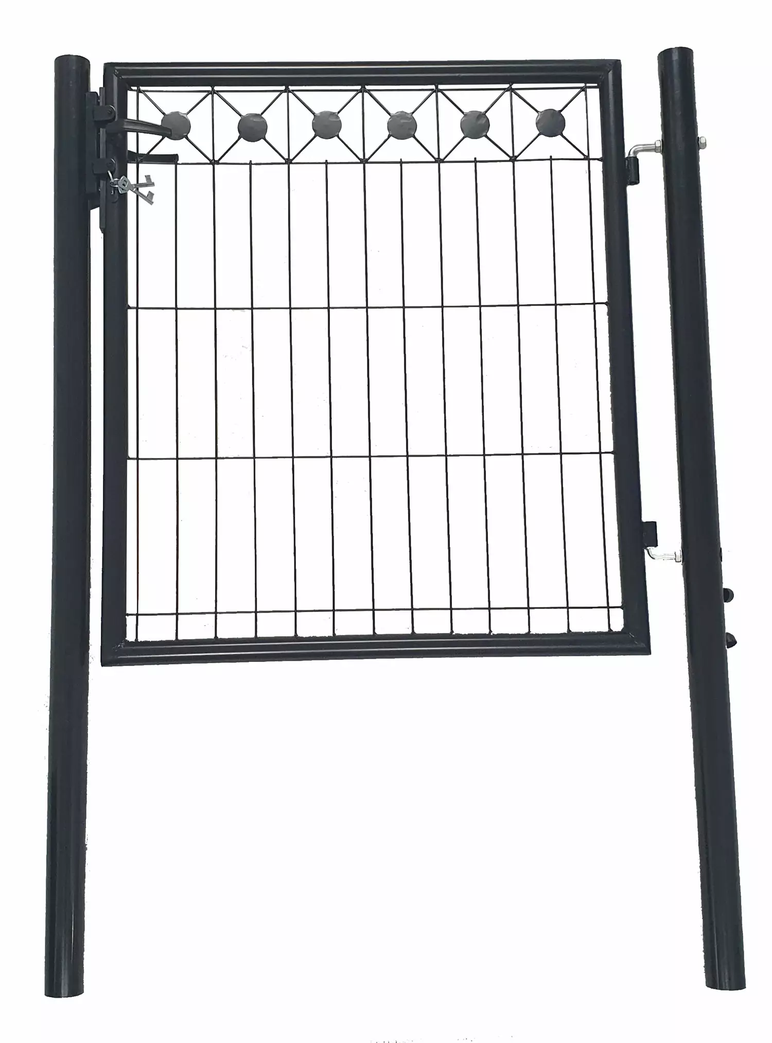 Lätt och hållbar gångport som passar bra till metallnätstaket. - Galvaniserad och svartmålad stål - Förpackningen innehåller: dekorativt nät, portstomme 87 x 87 cm, 2 stycken rörstolpar (diameter 64 mm x totalhöjd 150 cm), glidgångjärn, lås + 3 nycklar. Valt för antingen vänster- eller högerhängd. - Vikt: 15,50 kg