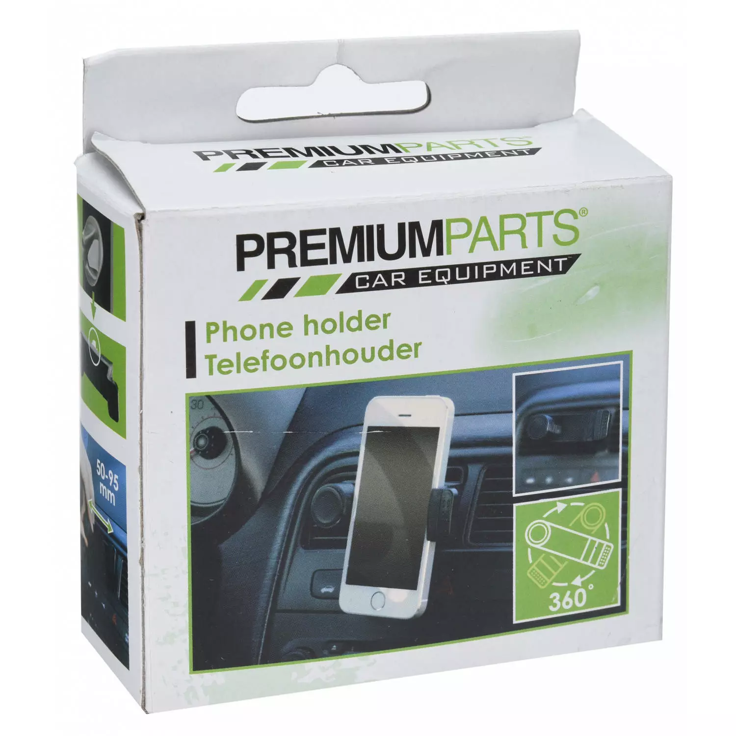 Fästen är enkelt att montera i bilen. När hållaren är fastsatt kan den vridas 360 grader. Färg: svart Material: plast Förpackningens mått: 8 x 8 x 3 cm (L x B x H) Minimumbredd för telefon: 50 mm Maximumbredd för telefon: 95 mm