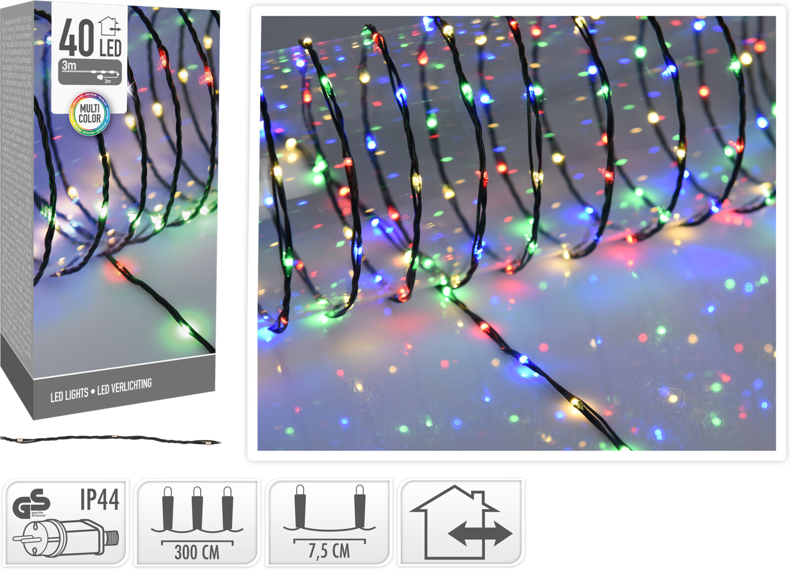 Multifärsat LED-ljussätt för inomhus- och utomhusbruk - 40 LED-lampor - längd 3 meter - IP 44 - avstånd mellan lamporna 7,5 cm - strömkabel 3 meter