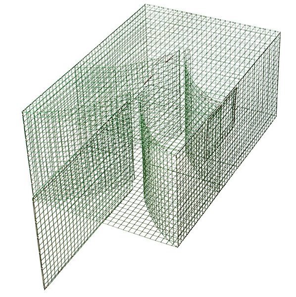 1-bent nätfälla - designad enligt samma princip som en fiskenät - yttre, bredare och inre, smalare del - stängslet levereras separat men är enkelt att fästa på plats - testad och fungerar för fångst av abborre samt exempelvis gädda - tillverkad av grön plastad aluzink-nät (1x1") - trådtjocklek: 2,0 mm, pvc-belagd - maskstorlek: 25 x 25 mm - längd: 107 cm (+ stängsel 45 cm) - bredd: 71 cm - höjd: 46 cm - vikt: 7,5 kg