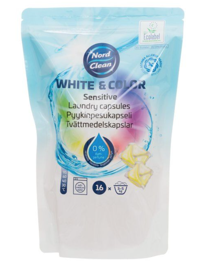 Nord Clean tvättkapslar är praktiska för maskintvätt. Tillsätt bara en kapsel i tvättmaskinen, ingen ytterligare dosering behövs. Tvättmedlet innehåller inga tillsatta färgämnen eller dofter, vilket gör det lämpligt för alla. Påsen innehåller 16 kapslar. Ecolabel och märkning av Nordiska allergi- och astmaförbundet. Bredd18 cm Djup8 cm Höjd27,5 cm Vikt0,34 kg Färgljusgul Materialnatriumlaurilsulfat, propylenglykol, vatten, trietanolamin, natriumdietyleentriamin pentametylinofonat 0,1 %, fenoxietanol, subtilisin, lipas