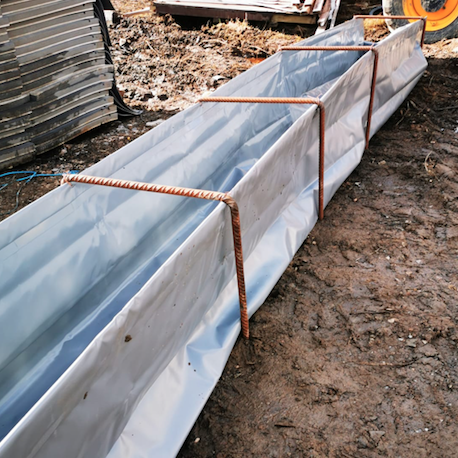 Sandfyllnadsbar översvämningsvall - av robust inhemsk PVC-duk - tillverkad i Sverige - höjd 60 cm - längd 6 meter - så kallad öppen korv - sandfyllnadsdel ca 60x60 cm - vikten av en fylld vall...