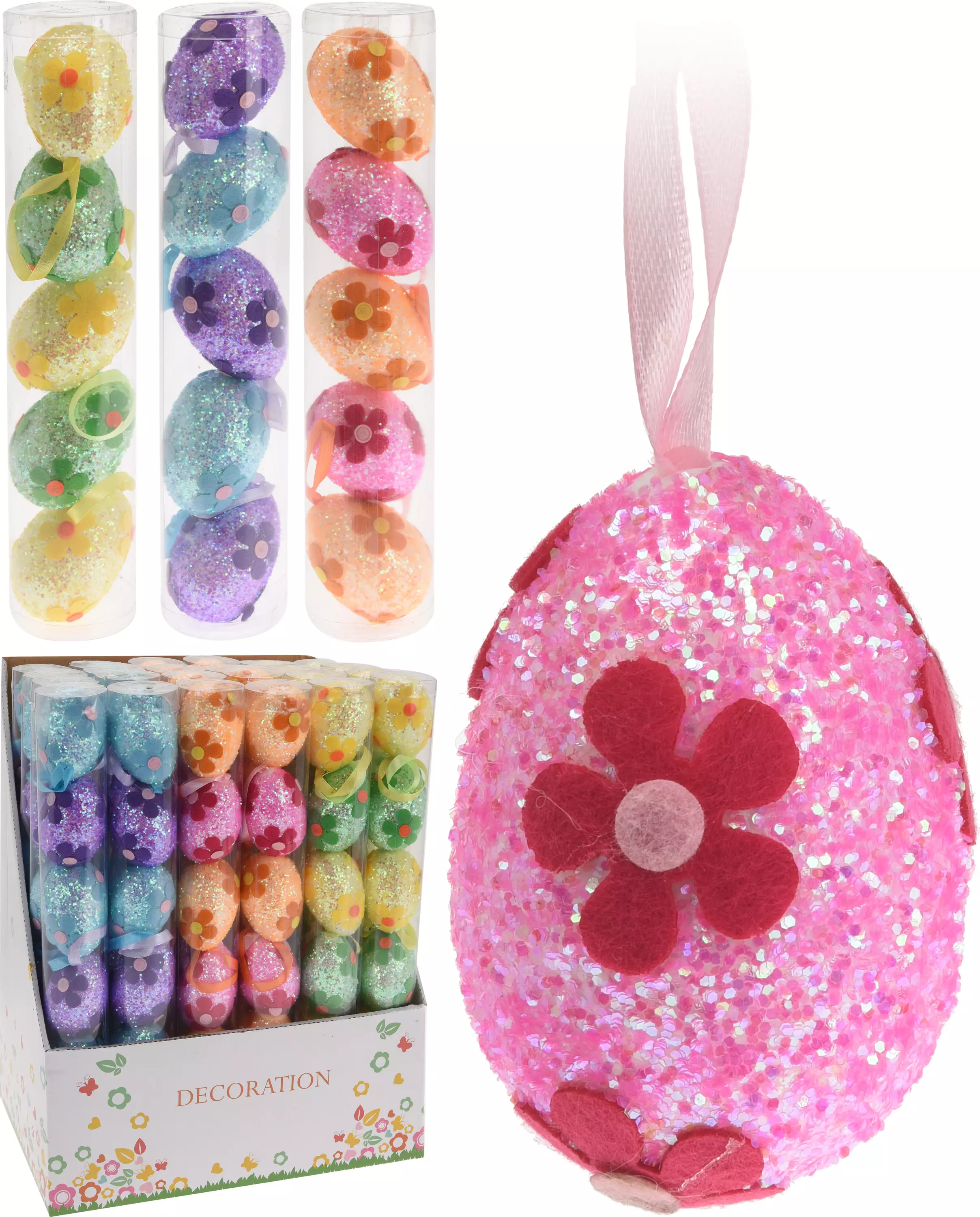 Hängande färgglada styroxägg med glitter- och filtdekorationer. Förpackningen innehåller 5 stycken. Storlek på ett ägg ca 6 cm.Obs! Blandat utbud: färg kan inte väljas vid beställning från webbshoppen. Önskemål kan anges fritt i beställningsprocessens textfält.