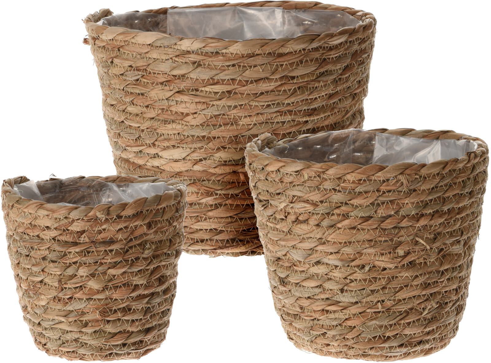 Flätad planteringskruka - plastinlagd insida - höjd 19 cm - diameter 23 cm - bilden visar den största krukan