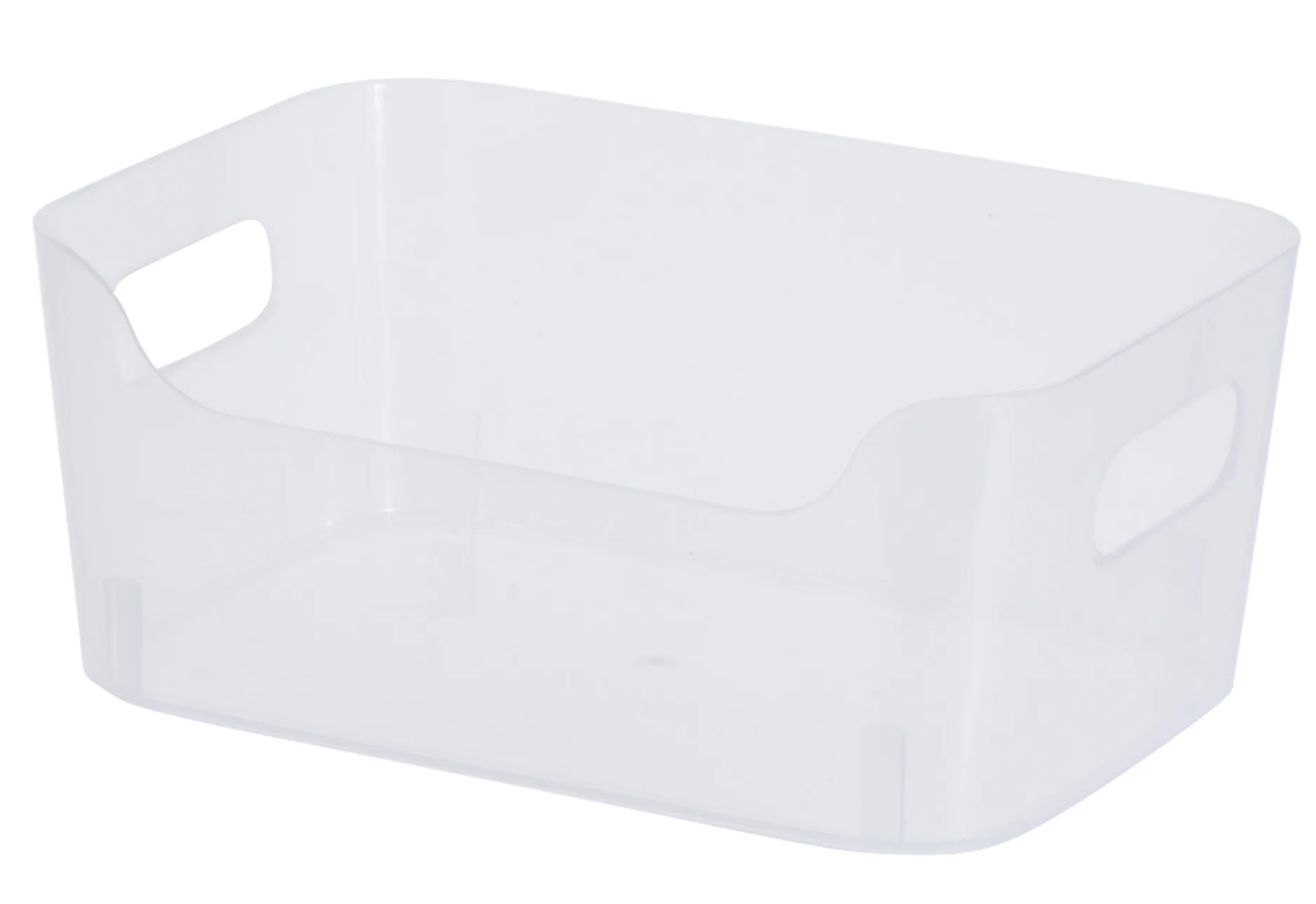 Genomskinlig mångsidig plastlåda- utan lock- handtag- höjd 8 cm (framsidan 6 cm)- bredd 19 cm- djup 13 cm