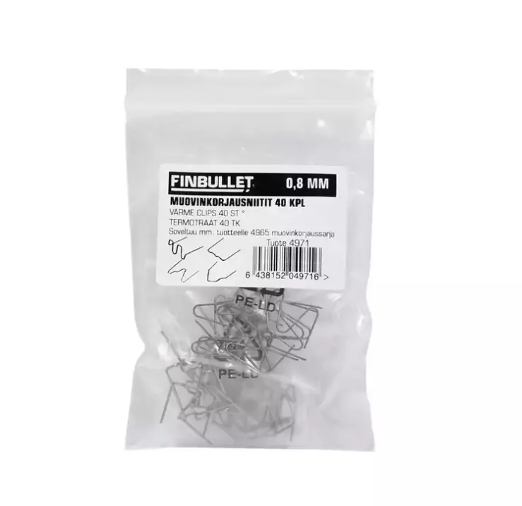 Plastreparationshäftapparat, 40 delar. Häftapparaten innehåller totalt 40 olika häftnålar: 10 st vågformade, 10 st mejselhäftnålar, 10 st M-häftnålar och 10 st hörnhäftnålar. Lämplig för användning med bland annat Finbullet 4965 produkten. Material: metall.