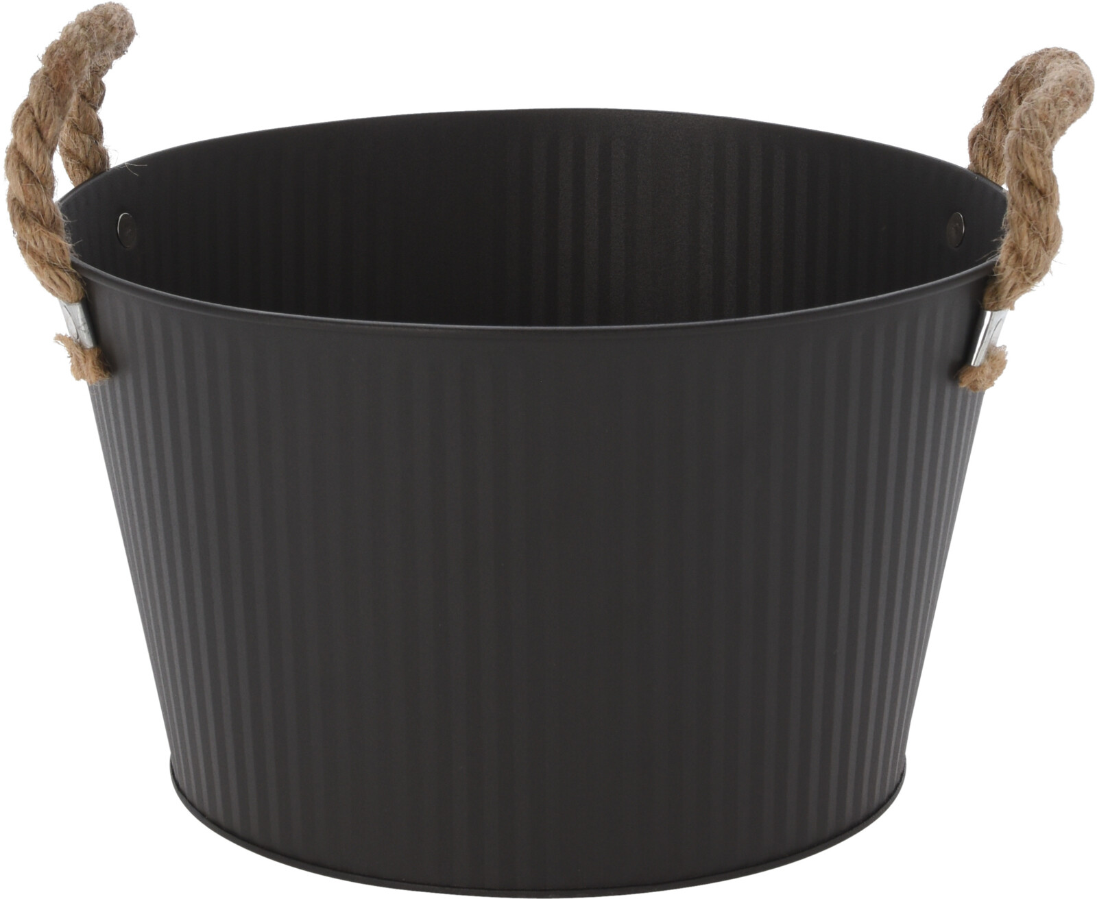 svart plåtkruka med jutesnörehandtag - övre diameter cirka 25 cm - botten diameter cirka 19 cm - höjd cirka 15 cm