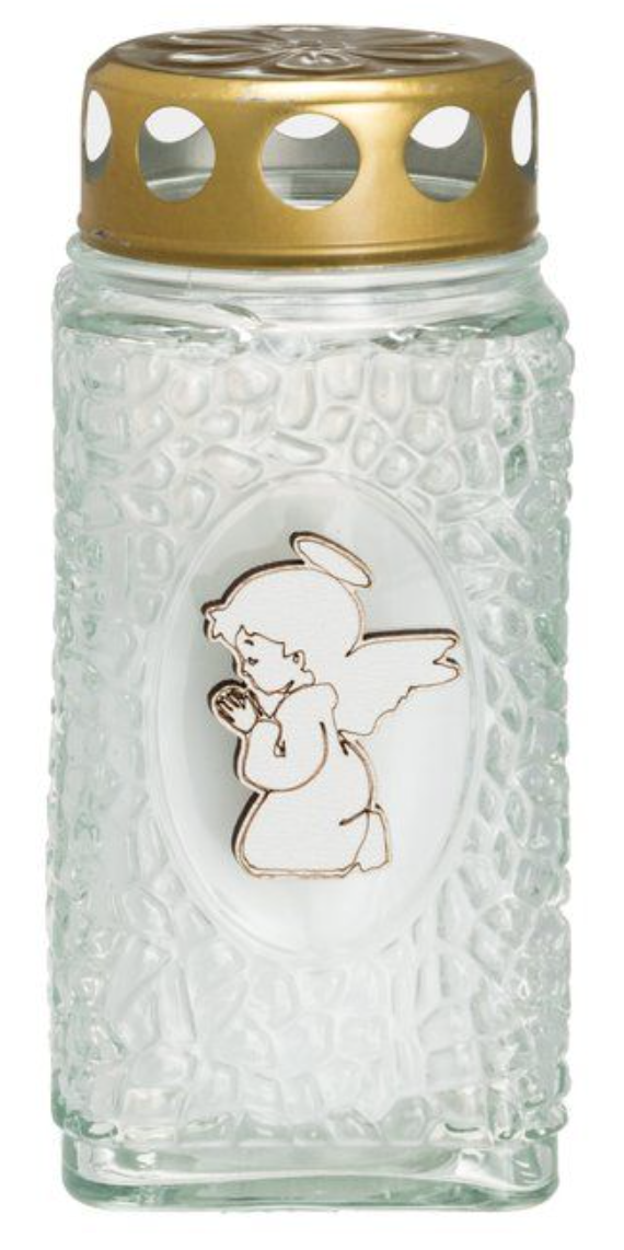 Vacker liten glas gravlykta med en trä ängeldekor. Mått 6 x 13 cm. Brinntid cirka 18 timmar. Bredd6 cmDjup6 cmHöjd13 cmVikt0,27 kgFärgklart glasMaterialglas, paraffin