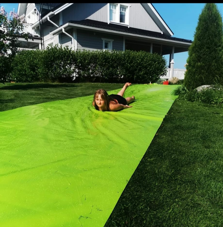 Vattenslidad rutschkana i grönt material meter för meter - lackerad och ftalatfri - bredd 205 cm - kvadratvikt 600 g / m² - längd valbar av kunden: 1 styck är 1 meter, kontrollera att du har rätt mängd produkt i din varukorg - vi skär presenningen från en rulle som är 205 cm bred, detta produkt har ingen retur- eller bytesrätt.