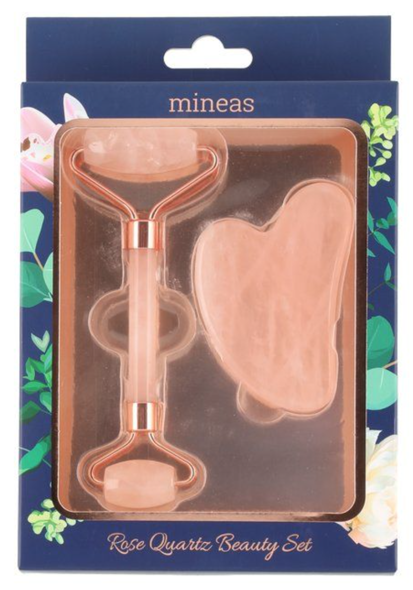 Presentpaket med rosenkvartsrulle och GuaSha-sten