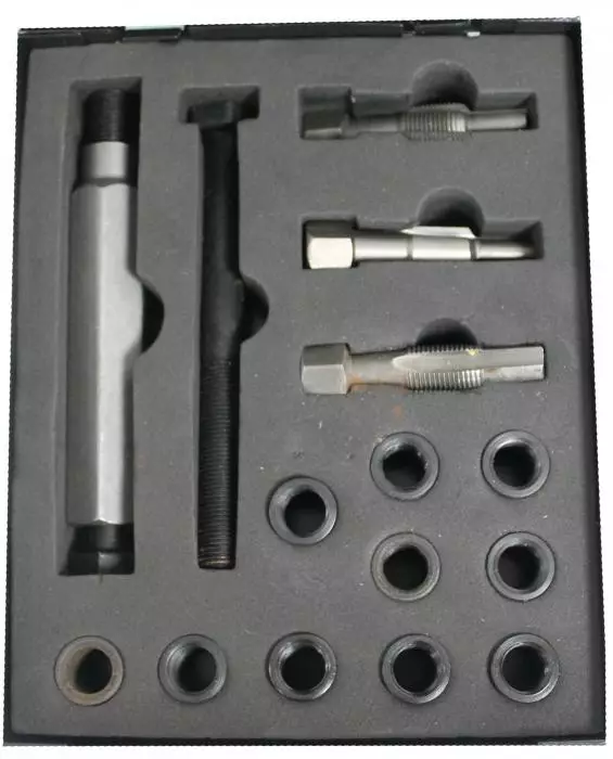 Komplett reparation kit för glödstiftgängor, passar för att öppna slitna M10-gängor eller för att reparera skadade gängor. Innehåll: * 5 st gängelement M10 x 1,0 mm, längd 12 mm * 5 st gängelement M10 x 1,0 mm, längd 19 mm * Gängstift för att rengöra den ursprungliga gängen * Fräs för att ta bort den ursprungliga gängen * Gängstift för gängreparationsdelen * Verktyg för att installera gängan