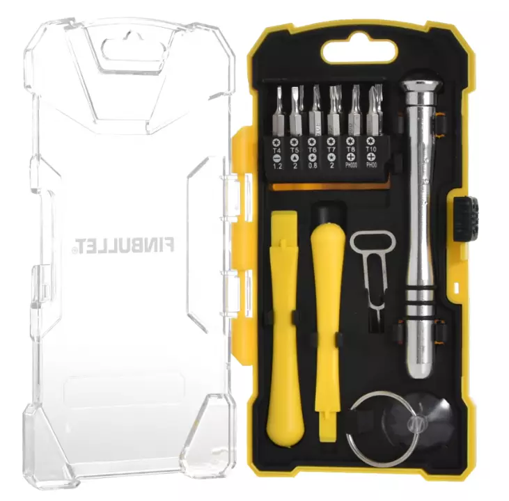 Smartphone 17-delars verktygssats Satsen inkluderar: 1 st BIT-skruvmejsel 2 st plastbrytarverktyg 1 st sugpropp 1 st verktyg för att öppna SIM-kortshållaren Platt: 1.2 Torx: T4, T5, T6, T7, T8, T10 Stjärna: 0.8, 2 Kors: PH000, PH00 Triangel: 2
