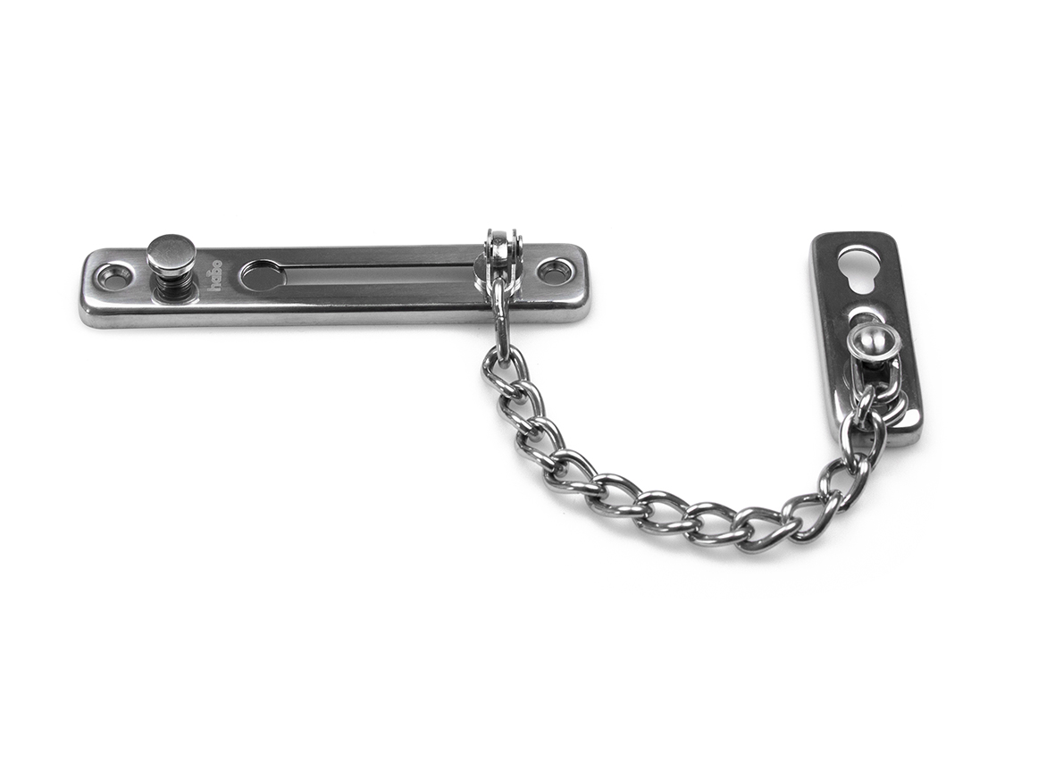 Säkerhetskedja i rostfritt stål. Kedjans fjäderlåsfunktion ger extra säkerhet, eftersom två händer behövs för att öppna den. Passar både inåt- och utåtgående dörrar.