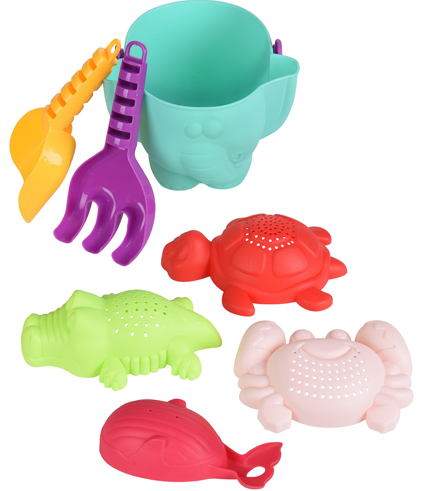 Färgglada plaststrandleksaker - 7-delar - Levererad färg kan avvika från bilden - Innehåller en sandbucket, spade, kratta och 4 sandformar