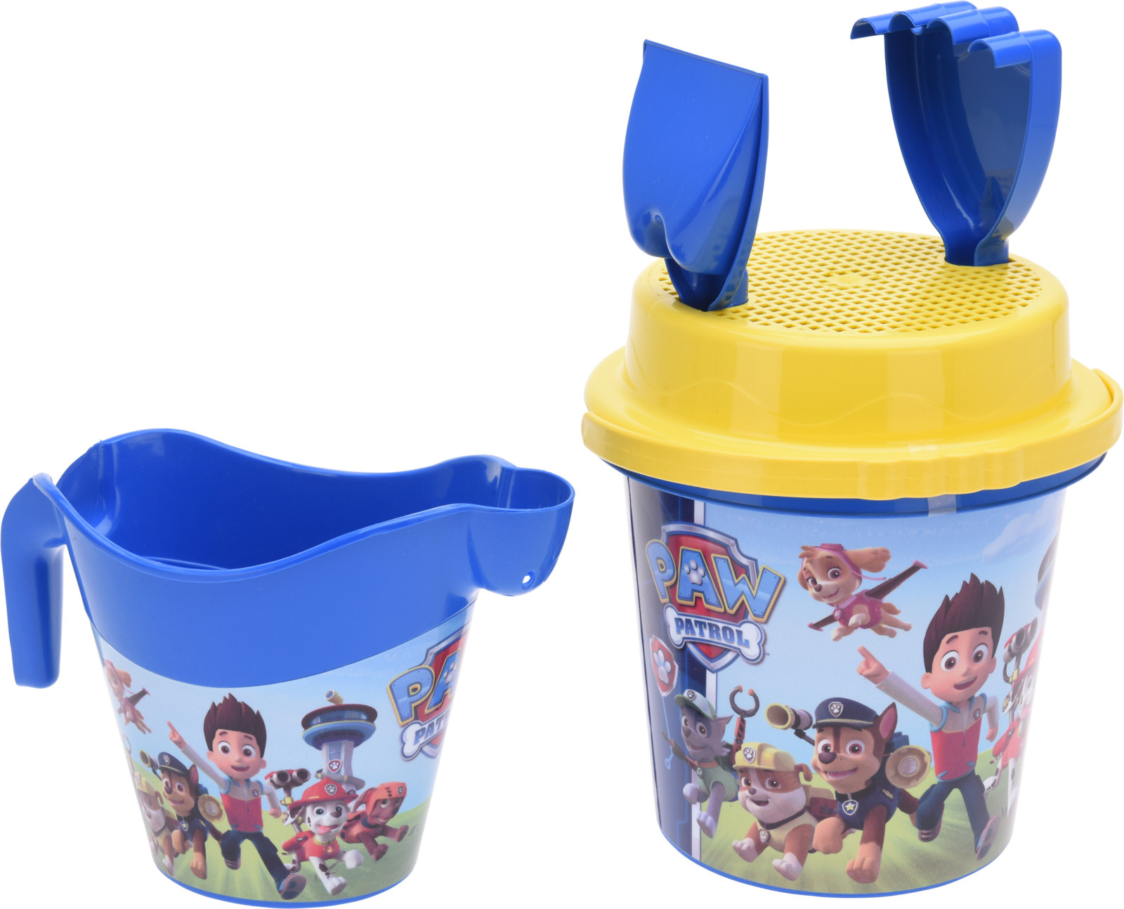 Sandleksats med spade, vattendunk, skottkärra, kratta och sandsikt.