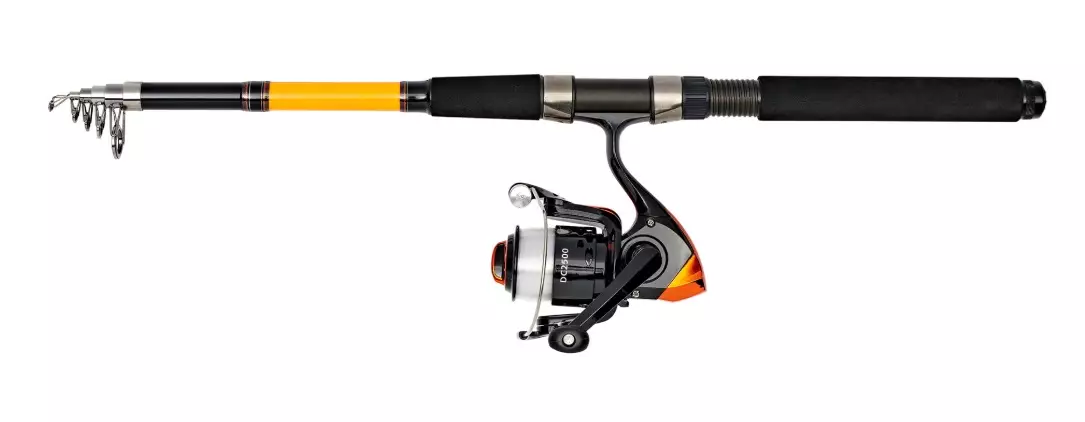 Det teleskopiska betesrulle-setet gör att det enkelt får plats i små utrymmen och är lätt att ta med sig. Setet innehåller rullen, DC2500B-betesrulle och 0,30 mm monofilamentlina.