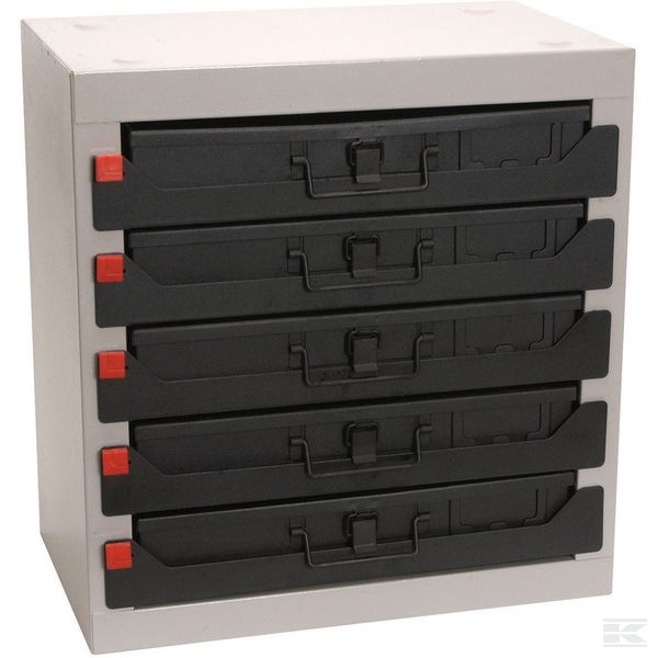 -Skåp för 5 olika 1202-sortiment -Skåp med 5 sorteringslådor -Tillverkat av blålackat metall, med lås. -Levereras utan produktutbud. -Mått: 440x415x255 mm