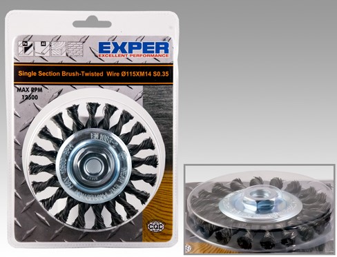 Skivborste 125 mm x M14 rostfritt - för borrmaskiner eller vinkelslipar - spindel Ø 6 mm, M14 eller 22 mm - flätad tråd Ø 0,35 mm