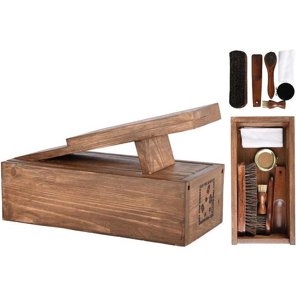 Presentidé! Det stiliga träskåpet innehåller ett skötselsats för skor med alla nödvändiga verktyg för att hålla läderskor i toppskick!- En träskohorn ingår, och locket på lådan kan enkelt stödjas som en rengöringsyta för skorna.- Använda material: furu, teaterträd, hästhår, vax och bomull