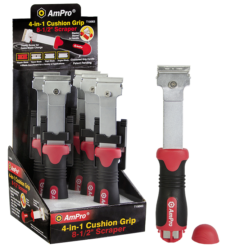 Skrapa med snabbjusterbara enkelsidiga blad. Satsen inkluderar en plastblads (för känsliga ytor), en hörnblad (för trä), ett 'rakblad' (för glas) och ett kraftigare blad (för trä/metall) - tre av bladen finns i skrapans handtag. - längd: 215 mm- ett års garanti