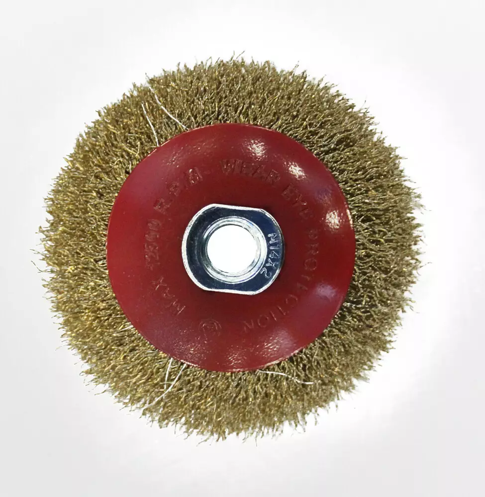 100 mm mässingsbelagd vågborste. Passar för vinkelslip. 12500 varv per minut, trådtjocklek 0,30 mm. För rengöring av metall och stål, borttagning av rost eller avlägsnande.