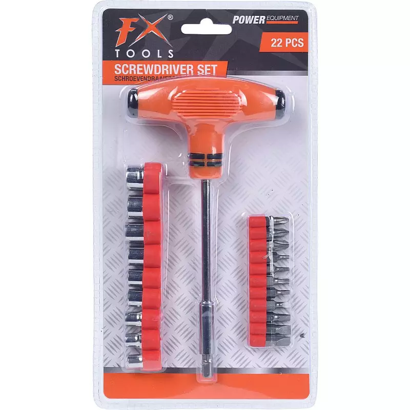 T-skruvdragare, KOLDITÄRMSBEHANDLADE OCH 1 ADAPTER, PACKAD I DUBBELKONSTRUKTION, FÄRGAD INSATS 245X130MM/ 145X35X260MM, DUBBELKONSTRUKTION: 1 T-KROK 1/4, THERMOPLAS. RUBB, 4 SOCKETS 5-5.5-6-7MM, 4 SOCKETS 8-9-10-11MM, 1 SOCKET 13MM, STÅL, 3 BITAR PH1-PH2-PH3, 3 BITAR T10-T15-T20, 5 BITAR FLAT3-4-5-6-7MM, STÅL, 1 ADAPTER