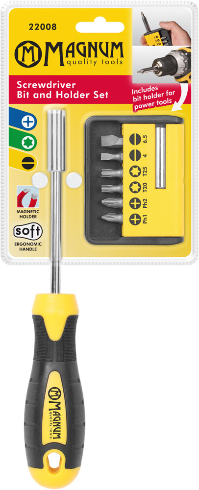 Skruvbitset med hållare, lämplig även för användning med elverktyg.Skruvmejseln har ett ergonomiskt utformat mjukt handtag som säkerställer ett bekvämt grepp.Inkluderar en praktisk plastlåda för magnetfästet och bitarna. - Ph1, längd 25 mm1/4"- Ph2, längd 25 mm1/4"- TORX T20, 25 mm1/4"- TORX T25, längd 25 mm 1/4"- skär 4.0 × 0.8 mm längd 25 mm 1/4"- skär 6.5 × 1.2 mm längd 25 mm 1/4"- mejsel 1/4" längd 100 mm - magnetfäste