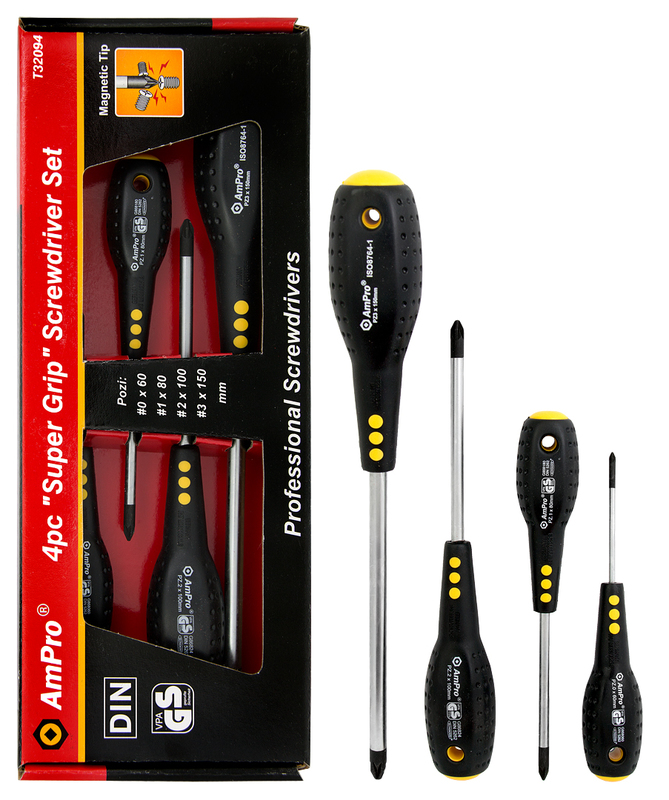 Skruvmejslar i krom-molybdenstål enligt DIN 5062-standard. Utrustade med gummihandtag "Super Grip" för ett halkfritt grepp även med oljiga händer. Skruvmejslarna har magnetiska spetsar. Produkten har livslång materialgaranti. Inkluderar följande Pozidrive-mejslar: - PZ0 (60 mm) - PZ1 (80 mm) - PZ2 (100 mm) - PZ3 (150 mm)