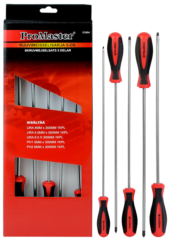 Skruvmejselsats i krom-vanadiumstål med en 300 mm lång spets. Skruvmejslarna har en magnetiserad spets och en formad tvåkomponentshandtag. - ett års garanti Inkluderar - spårskruvmejslar: 4 mm, 5,5 mm och 6,5 mm- skruvmejslar med Phillips-spets: PH1 och PH2