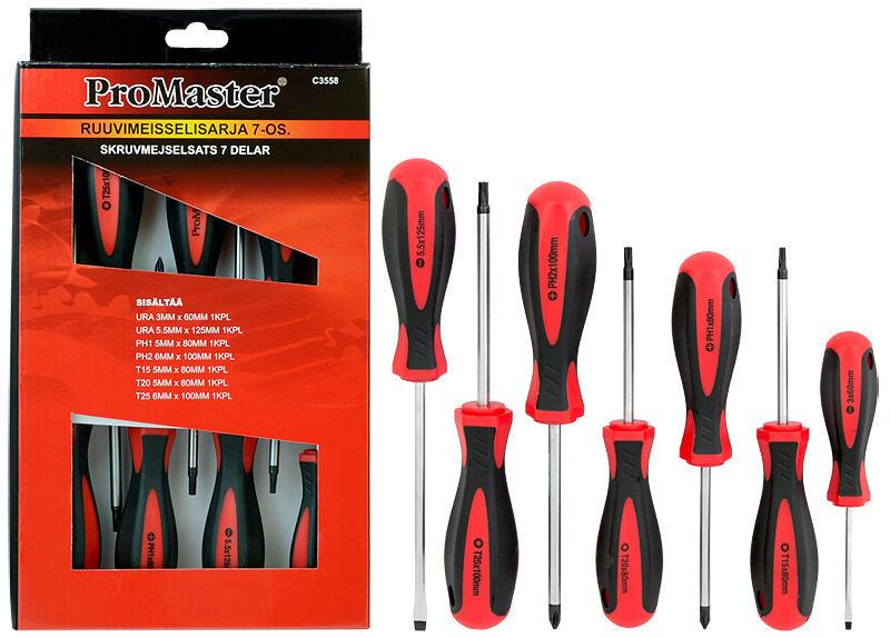 Skruvmejselsats tillverkad av kromvanadiumstål. Skruvmejslarna har en magnetiserad spets och en formad tvåkomponentshandtag. - 1 års garanti Innehåller - spårskruvmejslar: 3 mm (spetslängd 60 mm) och 5,5 mm (125 mm) - skruvmejslar med Phillips-spets: PH1 (80 mm) och PH2 (100 mm) - skruvmejslar med Torx-spets: T15 (80 mm), T20 (80 mm) och T25 (100 mm)