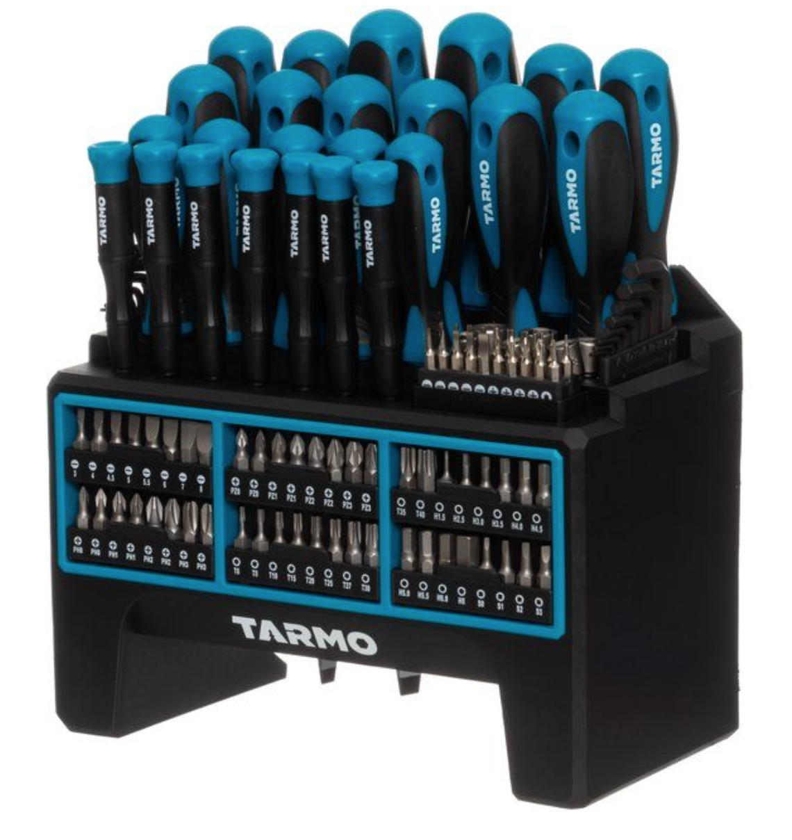 114-delars skruvmejsel-, insexnyckel-, bits- och hylssats. - Produkterna kommer i en praktisk och hållbar ställning där skruvmejslar, bytbara bits och hylsor förvaras säkert och är lättillgängliga. - Stället kan även monteras på väggen. - 3 års garanti. Innehåll: * 1 skruvmejsel för bytbara bits * 1 precision skruvmejsel för bytbara bits * 16 skruvmejslar: - 6 st mejslar: 8x150 mm, 6x150 mm, 6x100 mm, 5x100 mm, 5x75 mm, 3x75 mm. * 5 st Phillips: PH2X150 mm, PH2X100 mm, PH1x100 mm, PH1x75 mm, PH0x75 mm. * 3 st Torx: T10x75 mm, T15x75 mm, T20x75 mm. * 2 st fyrkantiga bits: S1x75 mm, S2x100 mm * 6 st precision skruvmejslar: 2 st mejslar: 2.5x40 mm, 3.0x40 mm * 2 st Phillips: PH00x40 mm, PH0x40 mm. * 2 st Torx: T6x2.5x40 mm, T7x40 mm * 16 st insexnycklar: 1/16", 5/64", 3/32", 1/8", 5/32", 3/16", 7/32", 1/4" & 1.5 mm, 2.0 mm, 2.5 mm, 3.0 mm, 4.0 mm, 5.0 mm, 5.5 mm, 6.0 mm * 6 st hylsor för skruvdragare: 6 mm, 7 mm, 8 mm, 9 mm, 10 mm, 11 mm * 48 st bits för skruvdragare (1” CR-V): Mejsel: 3 mm, 4 mm, 4.5 mm, 5 mm, 5.5 mm, 6 mm, 7 mm, 8 mm. * Phillips: PH0, PH0, PH1, PH1, PH2, PH2, PH3, PH3. Pozidriv: PZ0, PZ0, PZ1, PZ1, PZ2, PZ2, PZ3, PZ3. Torx: T6, T8, T10, T15, T20, T25, T27, T30, T35, T40. Insex: H1.5, H2.5, H3.0, H3.5, H4.0, H4.5, H5.0, H5.5, H6, H8. Fyrkantig bit: S0, S1, S2, S3. 20 st precision bits för skruvmejslar: Mejsel: 1.5 mm, 2.0 mm, 2.5 mm, 3.0 mm, 4.0 mm. * Phillips: PH000, PH00, PH0, PH1. Torx: T4, T5, T6, T7, T8, T9, T10, T15, T20. * Insex: H0.7, H0.9. Bredd23 cm Djup12 cm Höjd25,5 cm Vikt2 kg FärgSvart/blå MaterialPP, TPR, Cr-V-stål